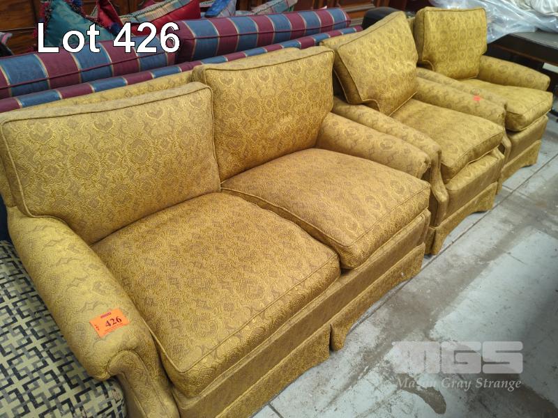 3 PIECE LOUNGE SUITE, GOLD FABRIC COMPRISING 2 SEATER & 2 x SINGLE SEATER ARM CHAIRS ON CASTORS