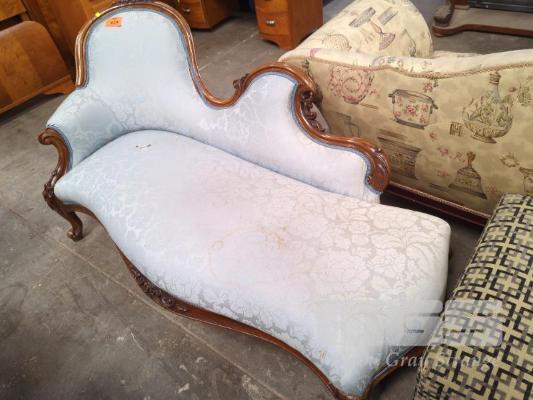 BLUE FABRIC UPHOLSTERED CHAISE LOUNGE, DECORATIVE CARVED TIMBER FRAME, TEAR IN FABRIC