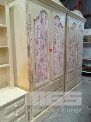 WHITEWASH HAMPTON STYLE CABINET, 2 DOOR CHICKEN WIRE & FABRIC FRONTED WITH 2 DRAWER UNDERSTORAGE