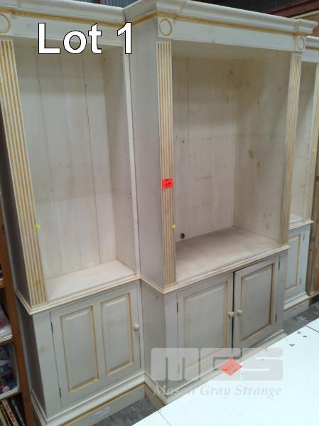 BEIGE PAINTED WALL UNIT 3 PIECE GREEK STYLE SHELF ABOVE STORAGE WITH 2 & SINGLE DOOR UNDERSTORAGE