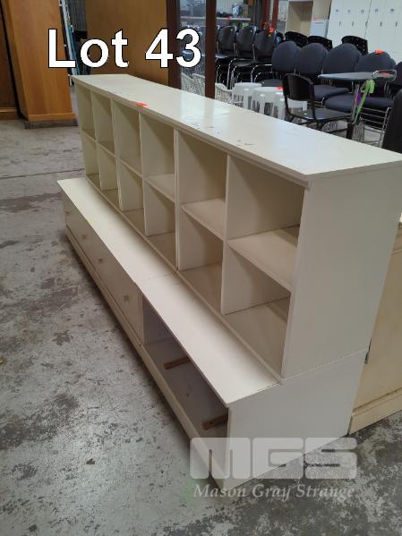 3 x WHITE PIGEONHOLE UNITS WITH 2 x HAVING UNDERSTORAGE,1 x MISSING DRAWER
