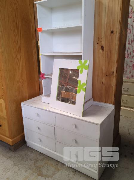 WHITE PAINTED 6 DRAWER CHEST, WALL MIRROR & BOOKCASE