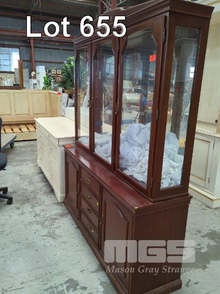 DISPLAY CABINET, MAHOGANY STAINED, 5 DOOR, 4 DRAWER, MIRROR BACKED PANEL