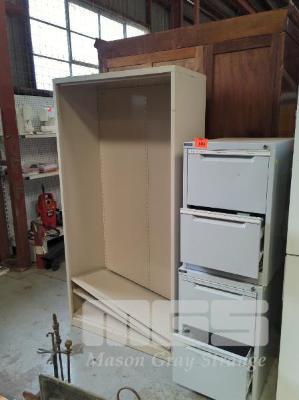 2 x GREY STEEL 2 DRAWER FILING CABINETS & BEIGE STEEL SHELF UNIT, NO SHELF CLIPS