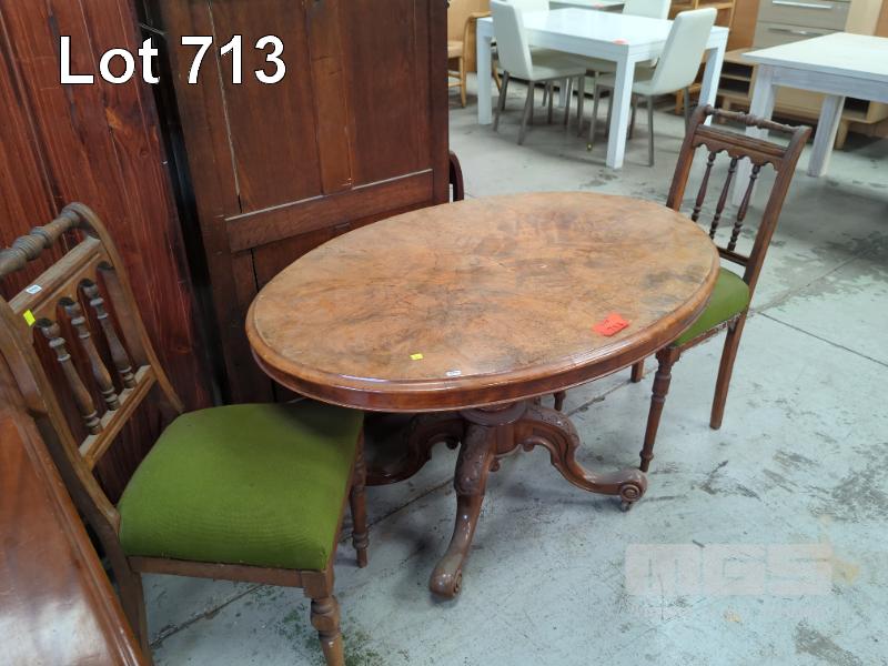 BURR WALNUT LOO TABLE, DECORATIVE CARVED SINGLE PEDESTAL BASE ON CASTORS WITH 2 X EDWARDIAN STYLE GREEN FABRIC UPHOLSTERED CHAIRS