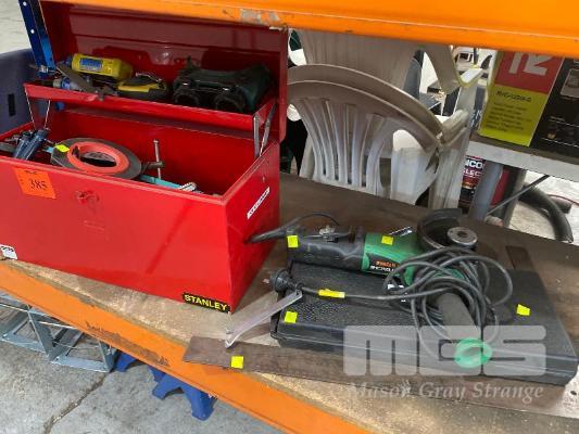 JBS TOOL BOX & ASSORTED HAND TOOLS INCLUDING CLAMPS, HACKSAWS, MEASURING TAPES, PLUM BOBS, WRENCHES, SCREWDRIVER SET & HITACHI G13SER ANGLE GRINDER, 125mm, 240V