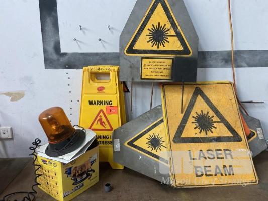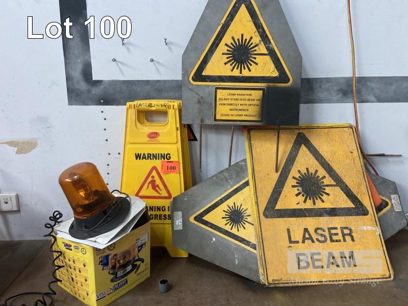 ASSORTED SAFETY SIGNS, SUIT LASER LEVEL SITE WORK & ORANGE SAFETY LIGHT, 12V