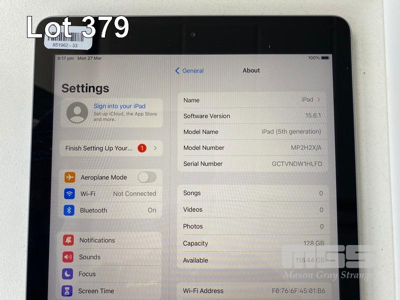 APPLE iPAD (5TH GEN), 128GB, Wi-Fi, SPACE GREY, MODEL A1822, MP2H2X/A WITH CABLE & CHARGER S/N:GCTVNDW1HLFD