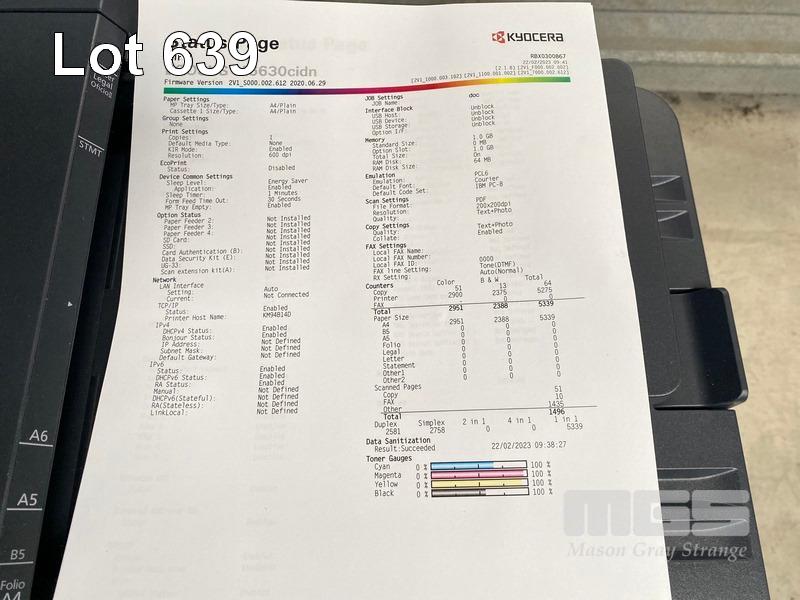 PRINTER, KYOCERA ECOSYS M6630cidn COLOUR LASER MFC, ADF, USB, NETWORK, 2,952 COLOUR & 2,388 B&W COPIES SHOWING (TEST PAGE ATTACHED)