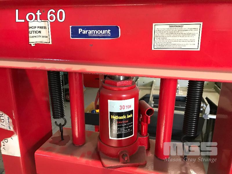 HYDRAULIC GARAGE PRESS, 30 TONNE BOTTLE JACK, 5 X ASSORTED FORM TOOLING ATTACHMENTS, PARAMOUNT BROWNS, MANUAL OP