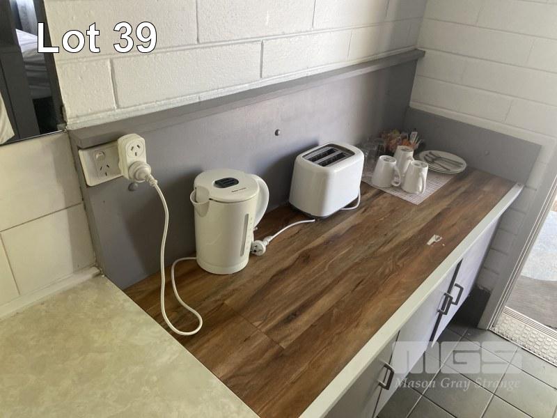 ROOM 11 CONTENTS DOUBLE & SINGLE BED, BAR FRIDGE, MICROWAVE, TOASTER & KETTLE, AVA 32" TV WITH REMOTE MOD: 32SSI SIDE TABLE, COUCH & COFFEE TABLE LG WALL MOUNT A/C, IRON & BOARD