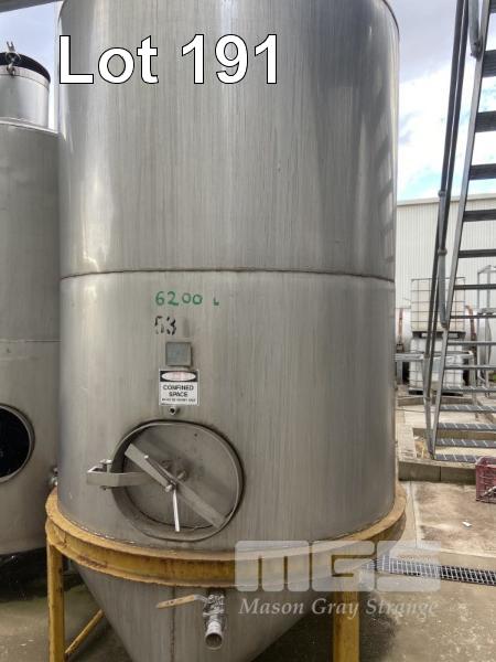 STAINLESS STEEL UPRIGHT TANK, 6,200 LITRE TOP & SIDE HATCHES CONICAL BASE & VALVES