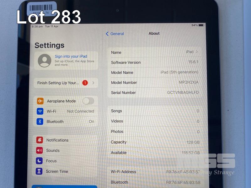 APPLE iPAD (5TH GEN), 128GB, Wi-Fi, SPACE GREY, MODEL A1822, MP2H2X/A WITH CABLE & CHARGER