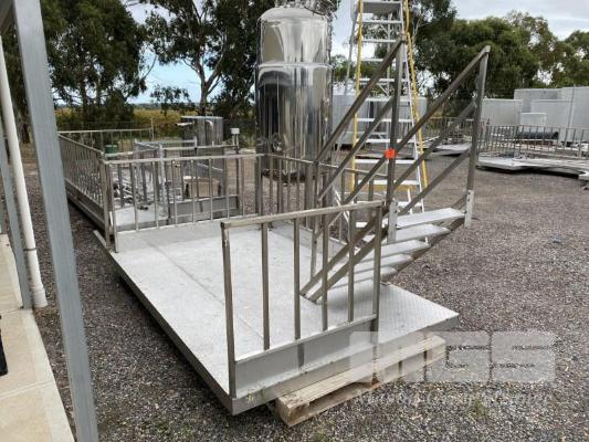 STAINLESS STEEL WORK PLATFORM WITH HANDRAILS, (GALV CHECKER PLATE BASE) 3000 x 2000mm, WITH STAIR SET, 5 STEP