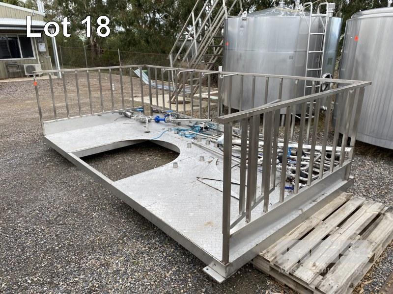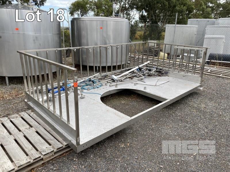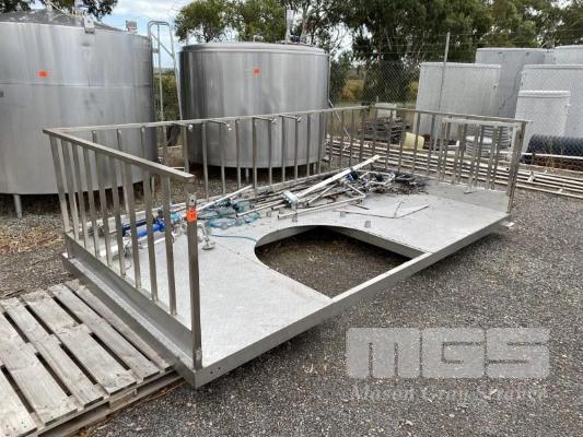 STAINLESS STEEL WORK PLATFORM WITH HANDRAILS, (GALV CHECKER PLATE BASE) 4000 x 2000mm, WITH CUT OUT TO SUIT 1200mm (D) TANK