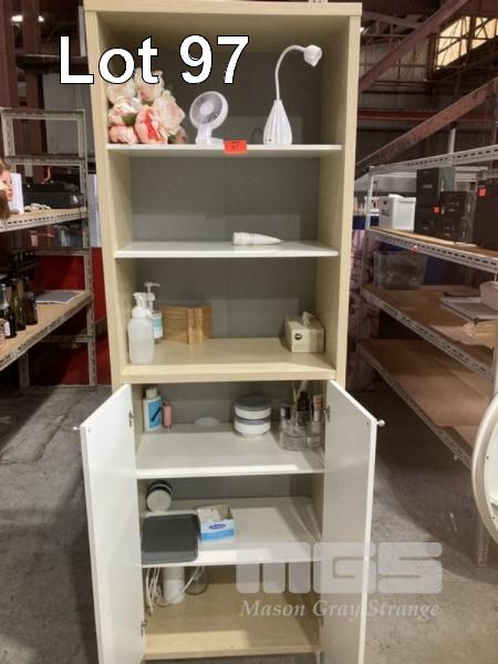 2 DOOR SHELF UNIT, 215 x 70cm & CONTENTS