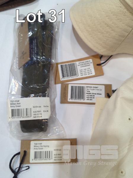 ASSORTED THRILLS ACCESSORIES 1 X DELL STRIPE WIDE BRIM HAT 1 X NEVER FORGOTTEN 6-PANEL CAP 1 X MILITARY BELT 1 X MILITARY CLIP KEYRING