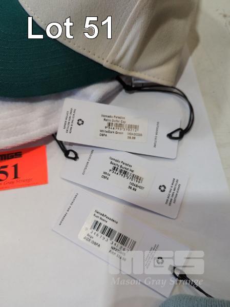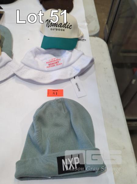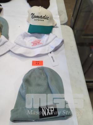 ASSORTED CAPS HATS & BEANIES 1 X NOMADIC RESORT PARADISE BEACH BUCKET HAT. 1 X NXP RUSH BEANIE. 1 X NOMADIC PARADISE RETRO GOLFER CAP.