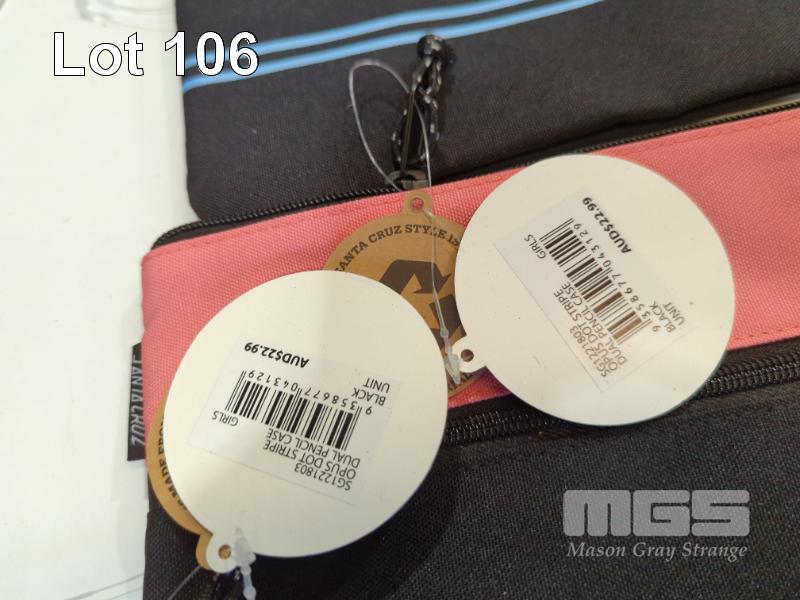 ASSORTED SANTA CRUZ GEAR 1 X SANTA CRUZ MFG DOT DRINK BOTTLE 3 X SANTA CRUZ OPUS DOT STRIPE DUAL PENCIL CASES 1 X SANTA CRUZ CABANA DOT STRIPE DUAL PENCIL CASE 1 X SANTA CRUZ CLASSIC DOT TERRY BUCKET HAT 1 X PAIR SANTA CRUZ THONGS - OBSCURE NEON. SIZE 9.