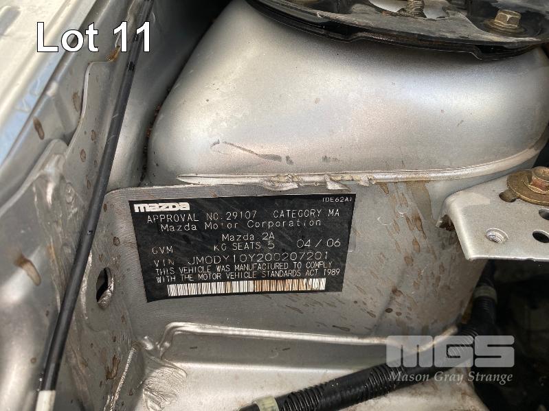 2006 MAZDA 2 HATCH FWD REG: XJR 162 (SA) VIN: JM0DY10Y200207201 ODO: 109,111kms SHOWING 1.5 LITRE, AUTO, PETROL, SILVER DUCO, 4 DOORS, 5 SEAT, FWD ABS, AIR BAG, AIR CON, ALLOY WHEELS, CD PLAYER, CENTRAL LOCKING, FOG LAMPS, POWER STEERING, POWER WINDOWS, SPARE WHEEL, KEY #4 (WITH 1 KEY/S)
