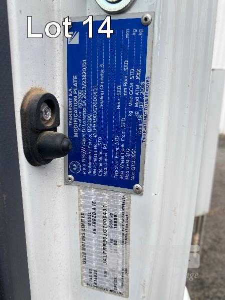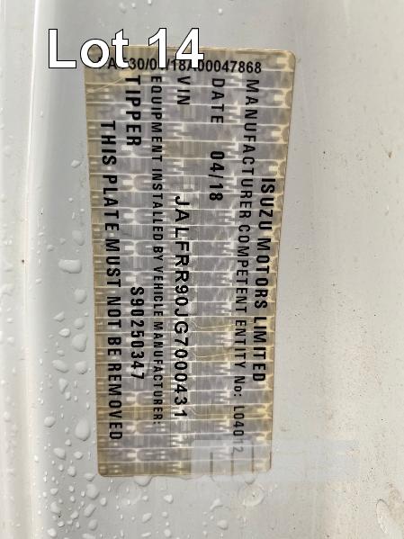 2018 ISUZU FH-FRR500 4x2 SINGLE CAB TIPPER REG: SB 67 NU (SA) VIN: JALFRR90JG700431 ODO: 75,295kms SHOWING GVM: 10,700kg GCM: 16,000kg 4 CYLINDER TURBO DIESEL, 6 SPEED MANUAL TRANSMISSION, SPRING SUSPENSION, WHITE DUCO, 2 DOORS, 3 SEAT, AIR CON, HYDRAULICS, TIPPER HOIST CONTROLS, TOW BALL HITCH REVERSING CAMERA SRS AIR BAGS 2 WAY TAILGATE & HINGED SIDES SPARE WHEEL BOOKS KEY #70 (WITH 1 KEY/S)