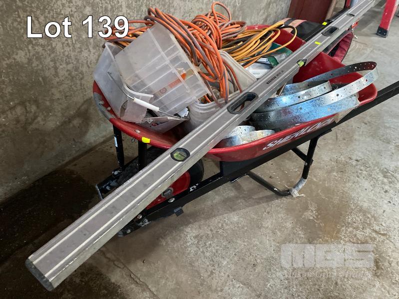 WHEELBARROW, SHERLOCK, 240V EXTENSION CORDS, STANLEY FATMAX SPIRIT LEVEL, 7' & ASSORTED GALV STEEL BANDING, FIXTURES, HAND TOOLS, ETC
