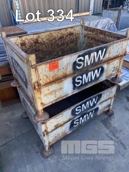 2 x STEEL PARTS BINS, 900 x 650 x 350, DROP SIDES