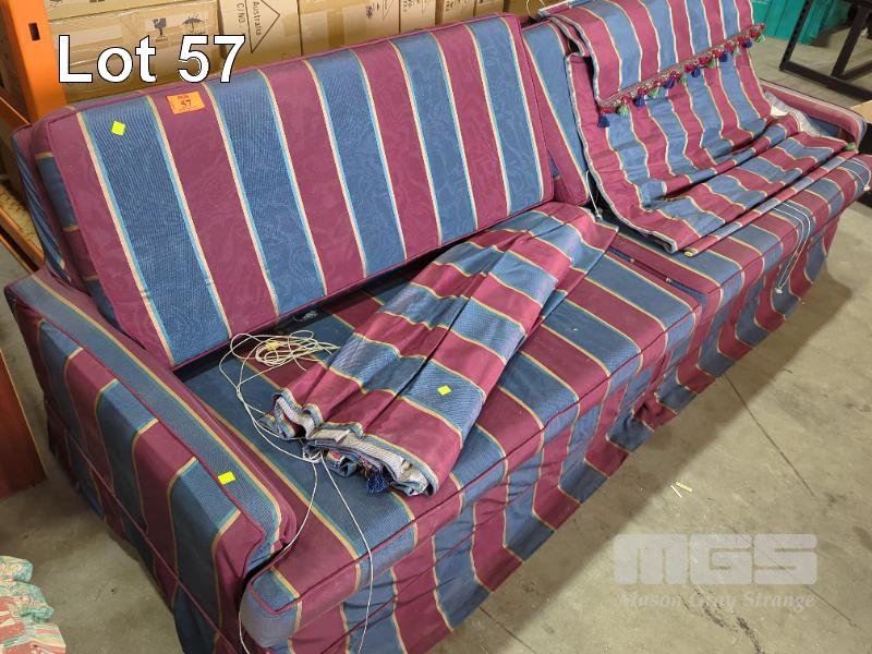 BLUE & BURGUNDY STRIPED FABRIC UPHOLSTERED SOFA WITH SCATTER CUSHIONS