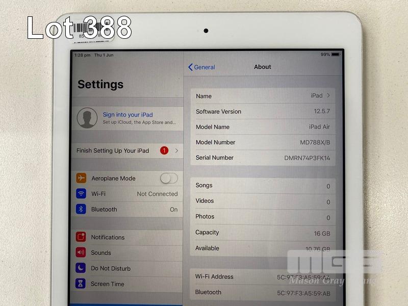 APPLE iPAD AIR, 16GB, Wi-Fi, SILVER, MODEL A1474, MD788X/B (NO CABLE, NO CHARGER) S/N:DMRN74P3FK14