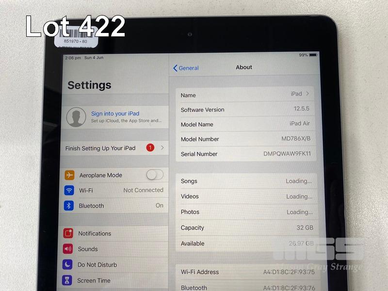 APPLE iPAD AIR, 32GB, Wi-Fi, SPACE GREY, MODEL A1474, MD786X/B (NO CABLE, NO CHARGER) S/N:DMPQWAW9FK11