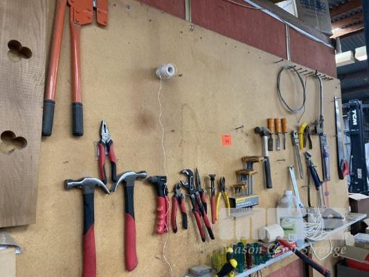 TOOL SHADOW BOARD, TROJAN TOOL SET, HAMMERS, PLIERS, CUTTERS, FIBRO CUTTER, T/BAR SET, ALLEN KEYS, DRIVERS, CHISELS, ETC
