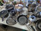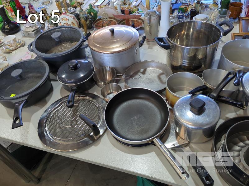 QUANTITY OF COOKWARE INCLUDING POTS AND PANS, FRYING PANS, PYREX BAKING DISHES, BOWLS & JUGS, CROFTON CAST ALUMINIUM FRY PANS & MORE (2 X TABLES & 1 X GREEN PLASTIC TUB. TUB NOT INCLUDED)