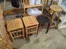 13 X ASSORTED RATTAN & SEAGRASS UTILITY BASKETS. 2 X SMALL BAMBOO SIDE TABLES, 2 X STOOLS AND RUSTIC LIMEWASHED 4-SHELF WOODEN RETAIL DISPLAY SHELF.