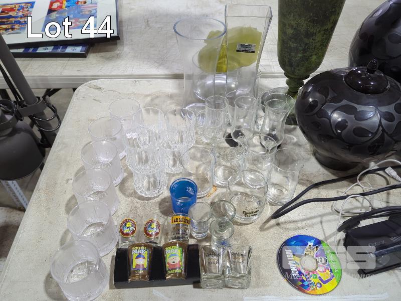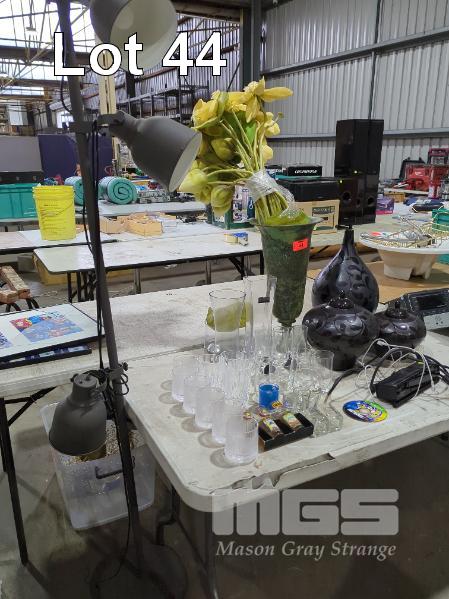 ASSORTED HOMEWARES ETC. INCLUDES 3-HEAD FLOOR LAMP, GLASS VASES, TUMBLERS & OTHER GLASSWARE, LARGE METALLIC VASE & IMITATION FLOWERS, LARGE CERAMIC PATTERNED VASE & JARS, X-BOX GAME CONSOLE SENSOR ETC.