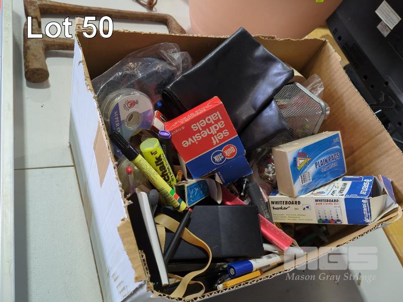 WALL MOUNTED MAGNETIC WHITEBOARD (120 X 90 CM W H), DOCUMENT TRAYS, STATIONERY, NOTEBOOKS AND LARGE QUANTITY OF OFFICE SUPPLIES INCLUDING WHITEBOARD MARKERS, HIGHLIGHTERS, PENS, PENCILS, STAPLES, STICKERS ETC. (PART TABLE & 1 X BOX)