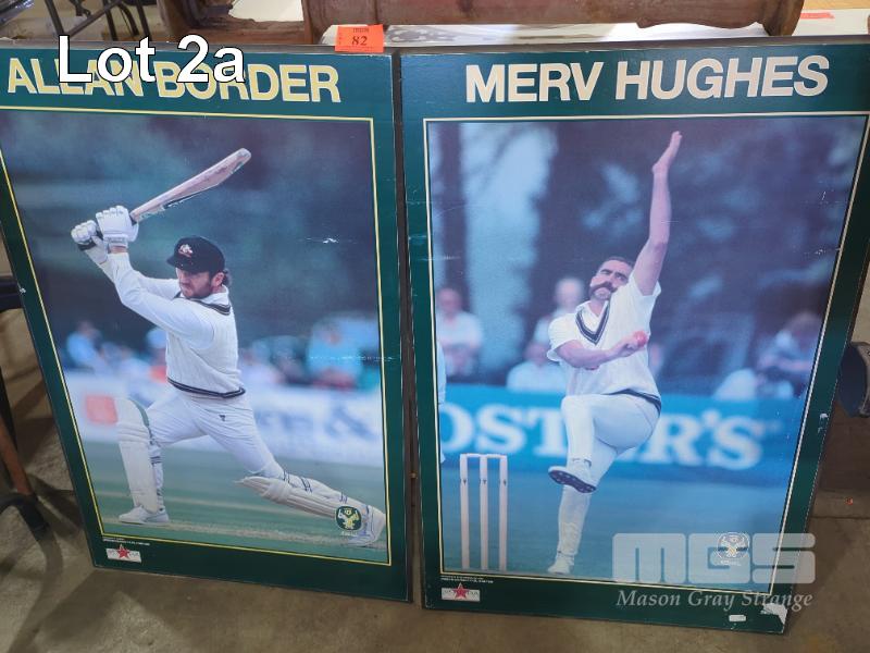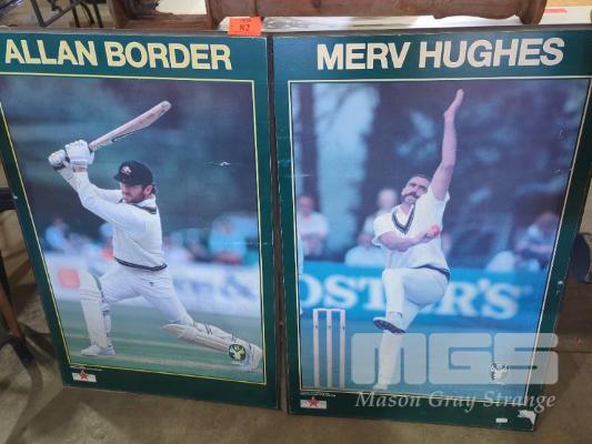 2 X BLOCK MOUNTED POSTERS AUSTRALIAN CRICKETERS IN ACTION, ALLAN BORDER & MERV HUGHES (60 X 90 CM W H)