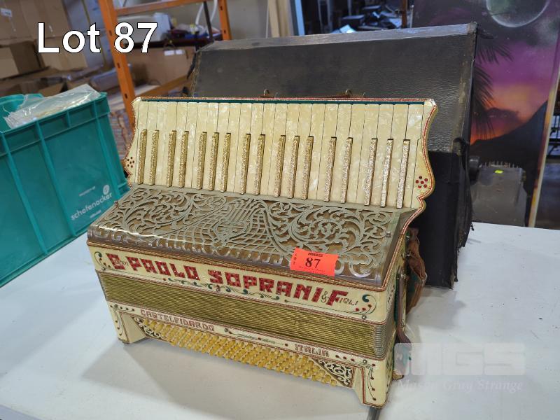 ANTIQUE PAOLO SOPRANI & FIGLI PIANO ACCORDION "CASTELFIDAROO ITALIA" AND CASE.