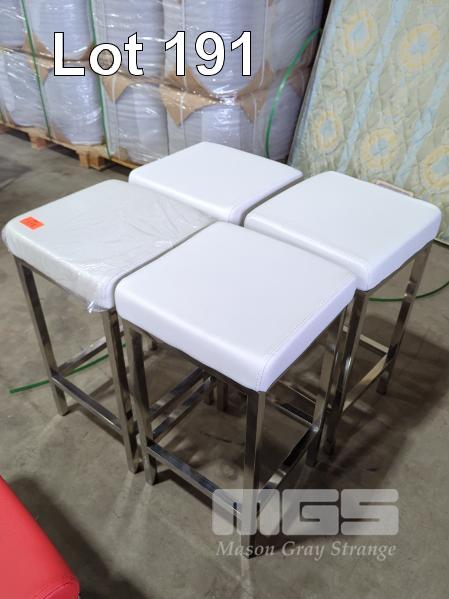 4 X PADDED BAR STOOLS, WHITE CUSHION, CHROME STEEL FRAME.