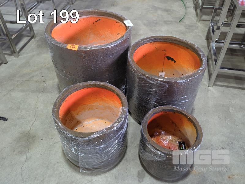 SET OF 4 X CONTEMPORARY PLANTER POTS. COLOUR CORTEN. NEW, NESTED PACKED. 1 @ 50 CM DIAMETER X 47 CM HEIGHT. 1 @ 42 CM DIAMETER X 40 CM HEIGHT. 1 @ 34 CM DIAMETER X 32 CM HEIGHT. 1 @ 27 CM DIAMETER X 25 CM HEIGHT.