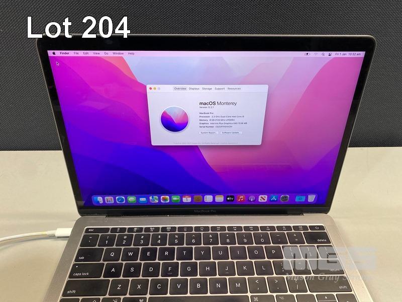LAPTOP, APPLE MACBOOK PRO (A1708), CORE i5 7360U (7TH GEN) @ 2.3GHz, 8GB DDR3 RAM, 512GB SSD, 13.3" RETINA DISPLAY (2560x1600), INTEL IRIS PLUS GRAPHICS 640, THUNDERBOLT 3, Wi-Fi, BLUETOOTH, MAC OS 12 INSTALLED (NO USB-C POWER SUPPLY) (NOTE: MESSAGE "BATTERY SERVICE RECOMMENDED", BATTERY NOT CHARGING, MINOR MARKS ON SCREEN) S/N:C02VP1YEHV2H