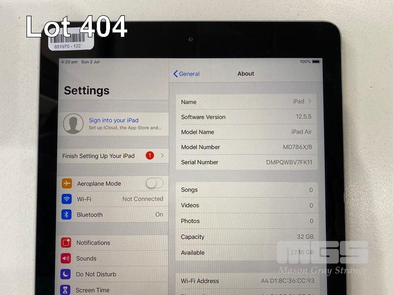 APPLE iPAD AIR, 32GB, Wi-Fi, SPACE GREY, MODEL A1474, MD786X/B (NO CABLE, NO CHARGER) S/N:DMPQWBV7FK11