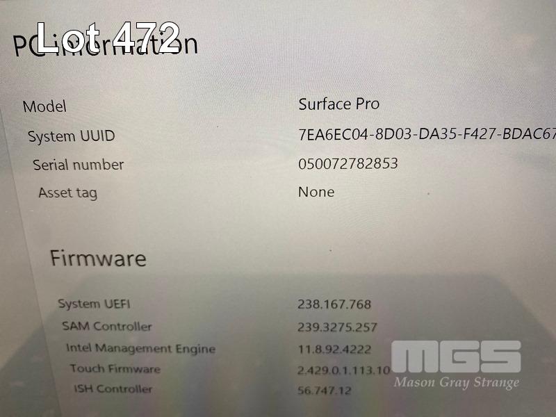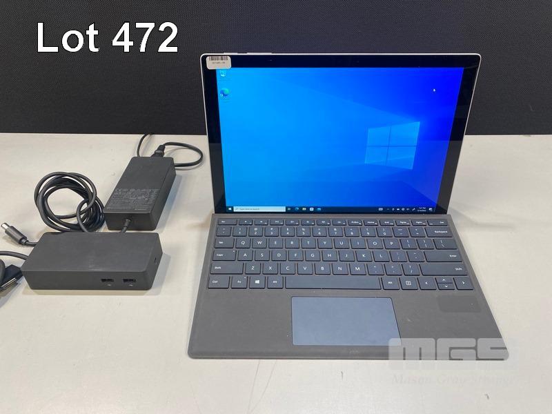 TABLET PC, MICROSOFT SURFACE PRO 5TH GEN, MODEL 1807, CORE i5 7300U (7TH GEN) @ 2.6GHz, 4GB RAM, 128GB SSD, 12.3" TOUCHSCREEN (2736x1824), INTEL HD GRAPHICS 620, Wi-Fi, CELLULAR, BLUETOOTH, WINDOWS 10 PRO INSTALLED, KEYBOARD TYPE COVER (NO TABLET POWER SUPPLY) WITH SURFACE DOCK (MODEL 1661) & POWER SUPPLY (MODEL 1749) S/N:050072782853