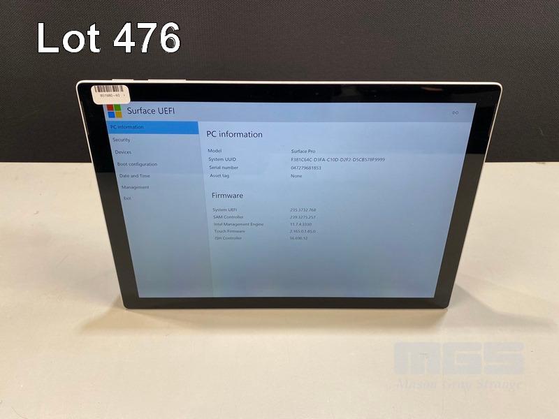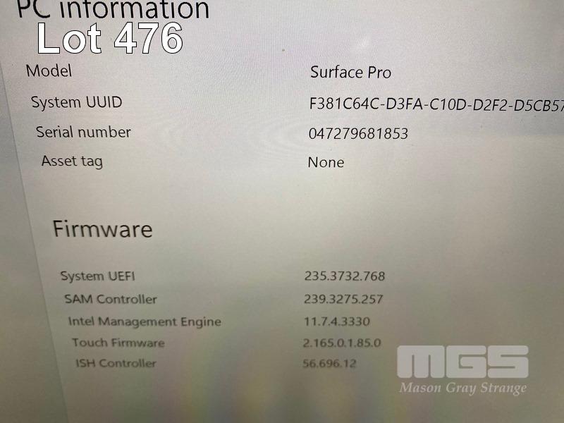 TABLET PC, MICROSOFT SURFACE PRO 5TH GEN, MODEL 1807, CORE i5 7300U (7TH GEN) @ 2.6GHz, 8GB RAM, NO HDD, 12.3" TOUCHSCREEN & POWER SUPPLY (NOTE: FAULTY) S/N:047279681853