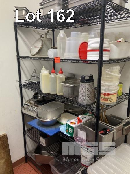 RACK & CONTENTS STAINLESS STEEL TRAYS, ALUMINIUM TRAYS, SCALES, TUBS, GRATER, ETC