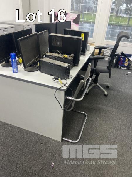 3 x 3 DRAWER FILING CABINETS, GREY MELAMINE, 2 DOOR STOCK CUPBOARD, MEETING TABLE & 2 x CHAIRS