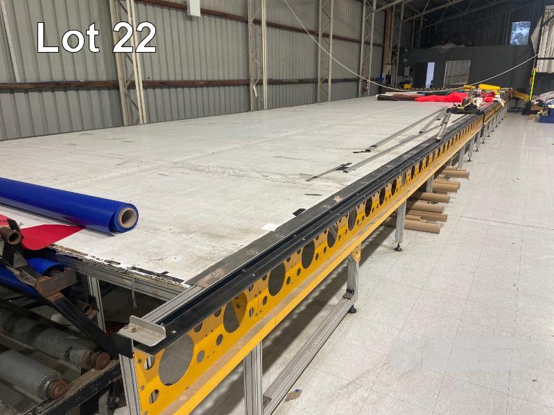MAXIS MATERIAL VACUMM CUTTING TABLE, PLC CONTROL 17.50 mtrs x 4.140mtrs. VACUUM TABLE WITH AERONAUT PENDANT CONTROL, TRAVEL CUTTING HEAD, APPLE AL IN ONE PC. ON PODIUM, 2400mm SECTION FULLY HEIGHT ADJUSTABLE 2 x PUMPS