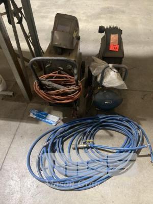 AIR COMPRESSOR, BLACK RIDGE & SIP 240V ARC WELDER WITH LEADS & HEAD SHIELD AND AIR HOSE.