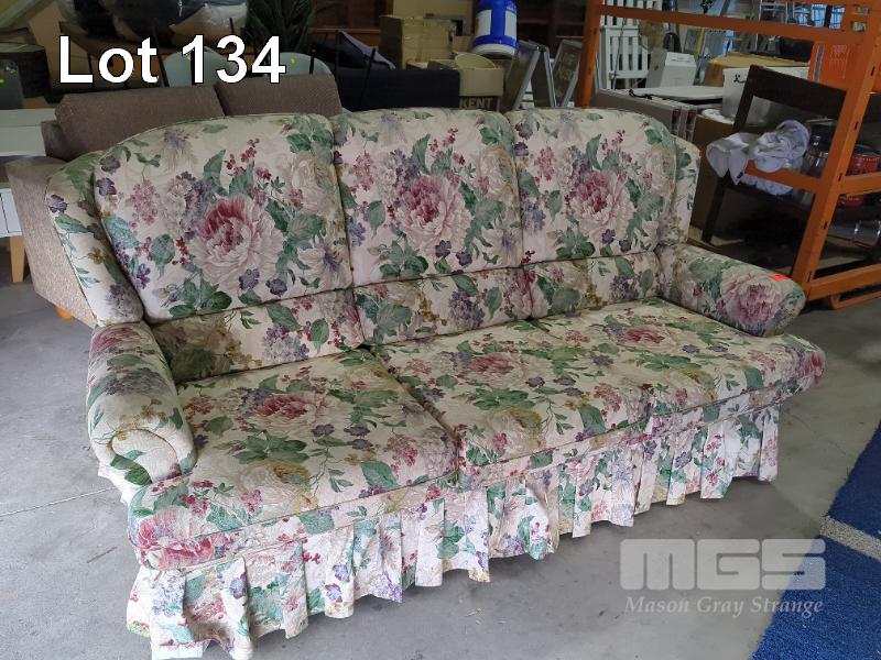 3-SEATER FLORAL FABRIC ARMCHAIR, CUSHION BACK WITH PANEL ARMS.