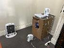 CONTENTS OFFICE 1 INCLUDING BAR FRIDGE, TIMBER DESK, TIMBER SIDE CUPBOARD, GREEN COUCH, 2 x OFFICE CHAIRS, 2 x ELECTRIC HEATERS & PINBOARD