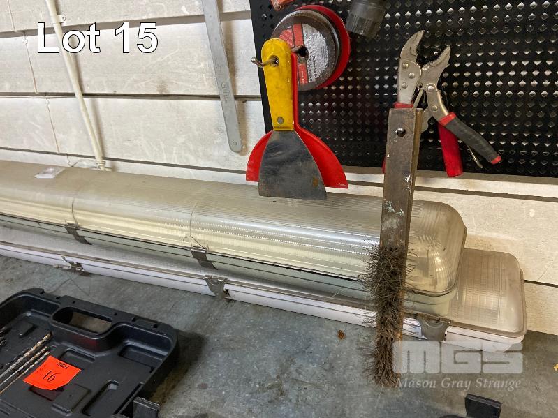 SHADOW BOARD & CONTENTS SHIFTERS, PLIERS, VICE GRIPS, PIPE WRENCH, STEEL RULER & 2 x FLURO LIGHTS